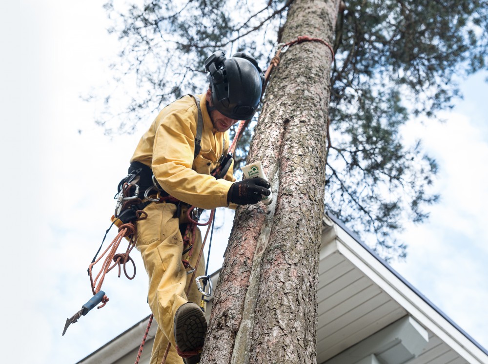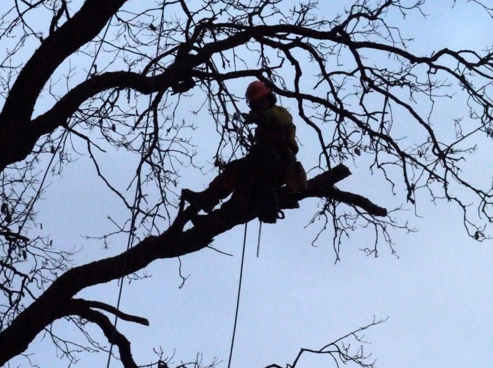 Арборист бережно срезает части ствола, начиная с самого верха, аккуратно спуская их на веревке.